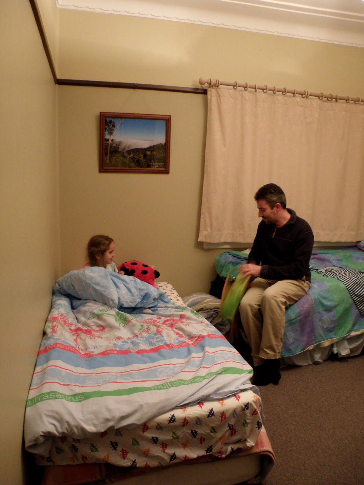 Lovely gorgeous pics! Settings I dont see usually from over there- thanks so much for posting! UUUmmm, I wanna be with hapy Non in that bed... its nice to see some from inside the house sometimes, one has no idea how its all like. The above pics are just astounding, the trees, the reflections... where were you? ( i see Blue Mountains, but how ... urm far or close is it? It looks like a corner of Japan and Britain mixed together, not Australia) Its funny how it really does even look like a May after rain day, even the flowers are all May. Love the one of Whale looking very pensive (actually thinking about a certain stock hi hi) And of course Non and Daddy crown it all. We went to the all known halloween trick or treat party yesterday, and back to everyday today. Anyway its bath time, they've just finished their yakitori and carrots so I"m off to have a shower with them- really glad you knew this, of course. XOXOXOXOXOXO Pifs!!!
